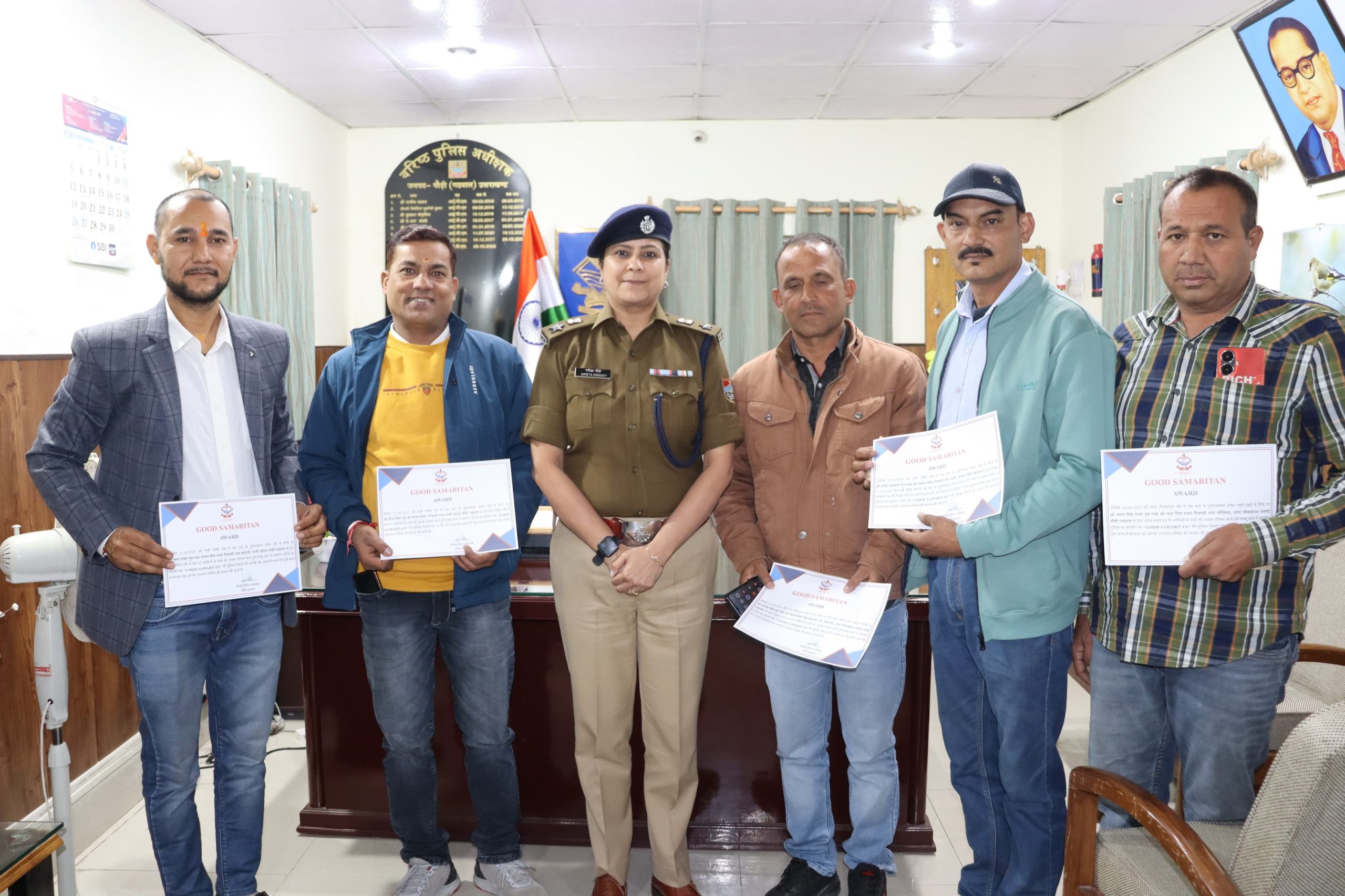 वाहन के गिरने की सूचना पर तत्काल स्थानीय निवासी 1. श्री मनोज बिष्ट पुत्र स्व0 श्री केशव सिंह बिष्ट, 2. श्री भारत सिंह रावत पुत्र स्व0 श्री चतर सिंह रावत द्वारा शवों को अथक परिश्रम करते हुये रेस्क्यू कर गहरी खाई से निकालने में स्थानीय पुलिस का सहयोग कर “GOOD SAMARITAN” की भूमिका निभाई गई। जिसके क्रम में आज दिनाँक 31.10.2023 को राष्ट्रीय एकता दिवस के अवसर पर *श्रीमान वरिष्ठ पुलिस अधीक्षक महोदया पौड़ी श्रीमती श्वेता चौबे द्वारा उक्त 09 व्यक्तियों को “GOOD SAMARITAN” का प्रशस्ति पत्र देकर सम्मानित किया गया।