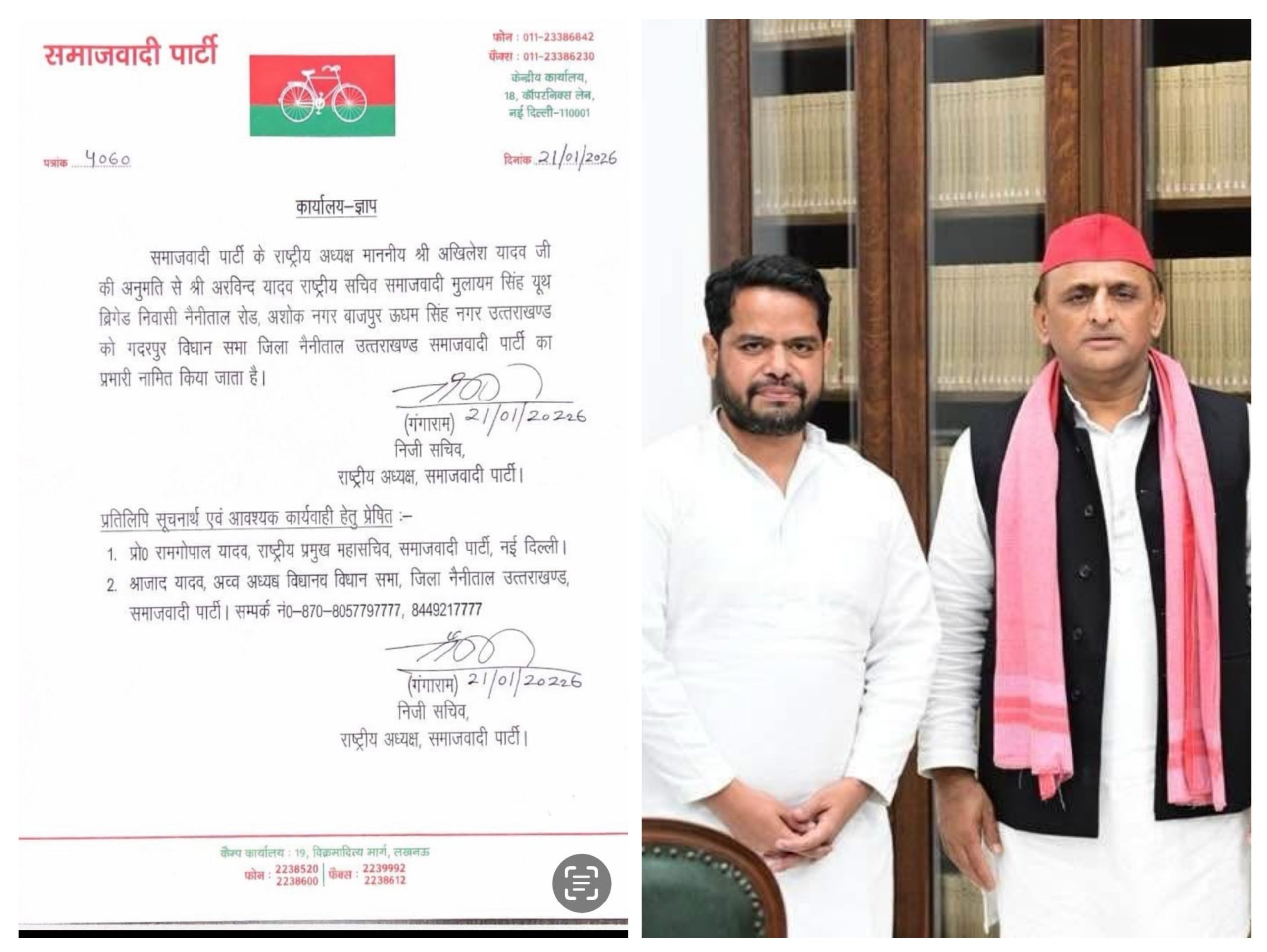 बाजपुर— समाजवादी पार्टी के राष्ट्रीय अध्यक्ष माननीय श्री अखिलेश यादव जी के निर्देशानुसार अरविंद यादव, राष्ट्रीय महासचिव, समाजवादी पार्टी (मुलायम सिंह यूथ), निवासी बाजपुर को विधानसभा गदरपुर एवं लोकसभा नैनीताल का पार्टी प्रभारी नियुक्त किया गया है।