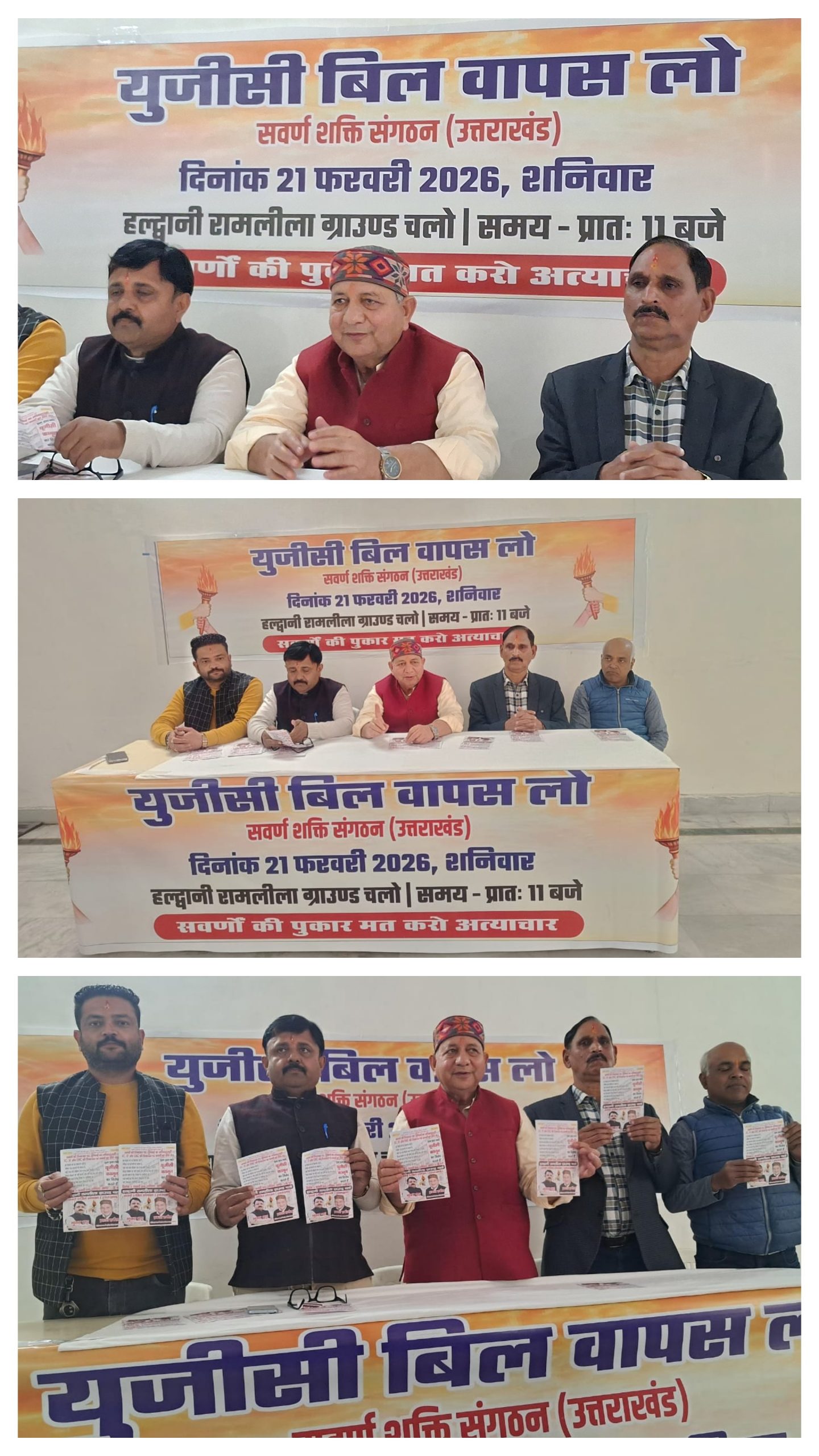 हल्द्वानी—   हल्द्वानी में सवर्ण शक्ति संगठन(उत्तराखंड) के संयोजक प्रकाश हर्बोला द्वारा पत्रकार वार्ता की गई, जिसमें यूजीसी के काले कानून के विरोध में सवर्ण शक्ति संगठन के संयोजक प्रकाश हर्बोला ,सहसंयोजक भुवन भट्ट, सदस्य जगत सिंह बिष्ट ,सदस्य मनोज अग्रवाल, सदस्य तरूण वानखेड़े, आदि लोग उपस्थित रहे।