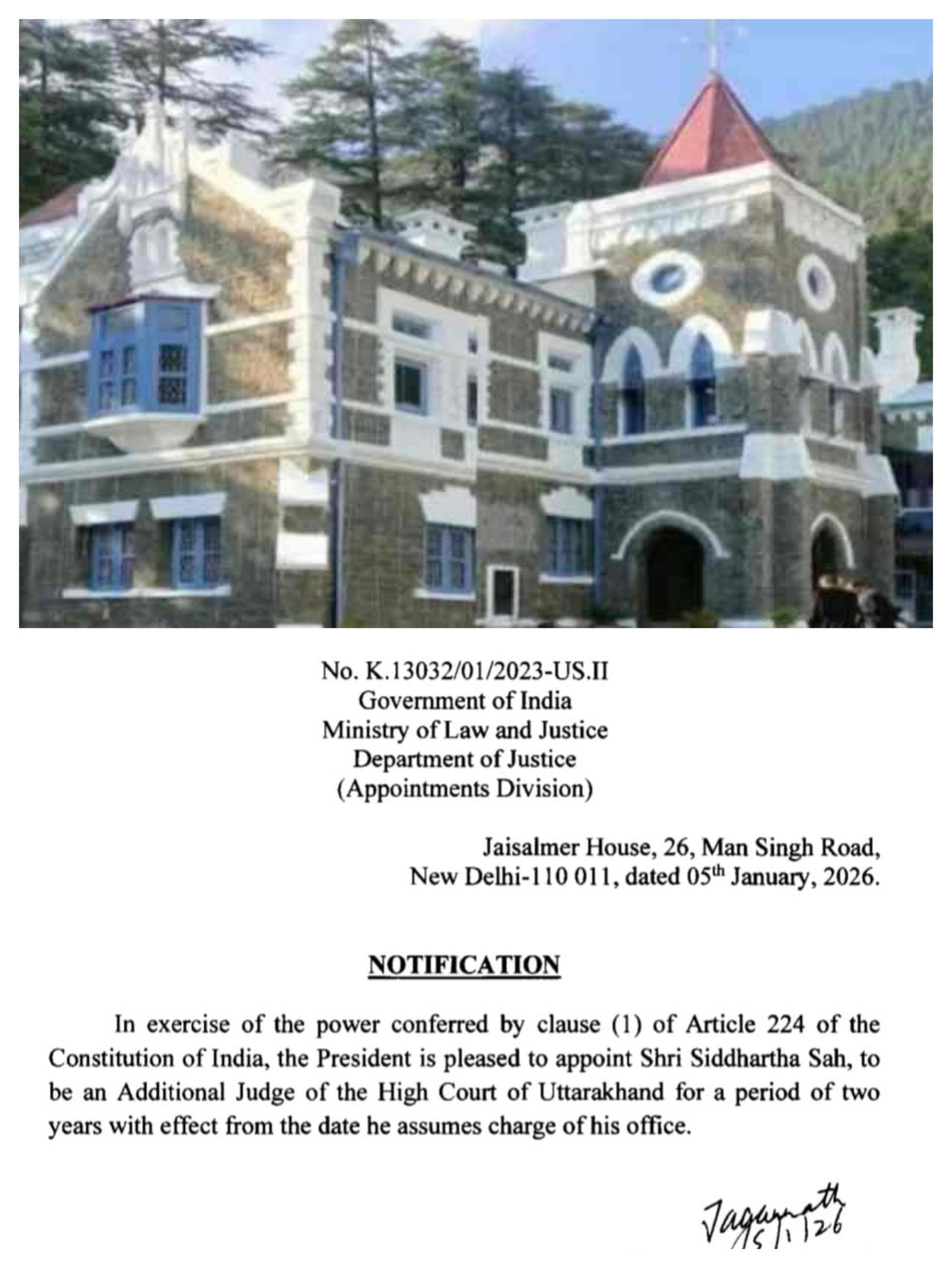 उत्तराखंड—   भारत की राष्ट्रपति दौपदी मुर्मू ने संविधान में मिली अपनी शक्तियों का प्रयोग करते हुए उच्च न्यायालय के अधिवक्ता सिद्धार्थ साह को दो वर्ष के लिए अतिरिक्त न्यायाधीश बनाया है।