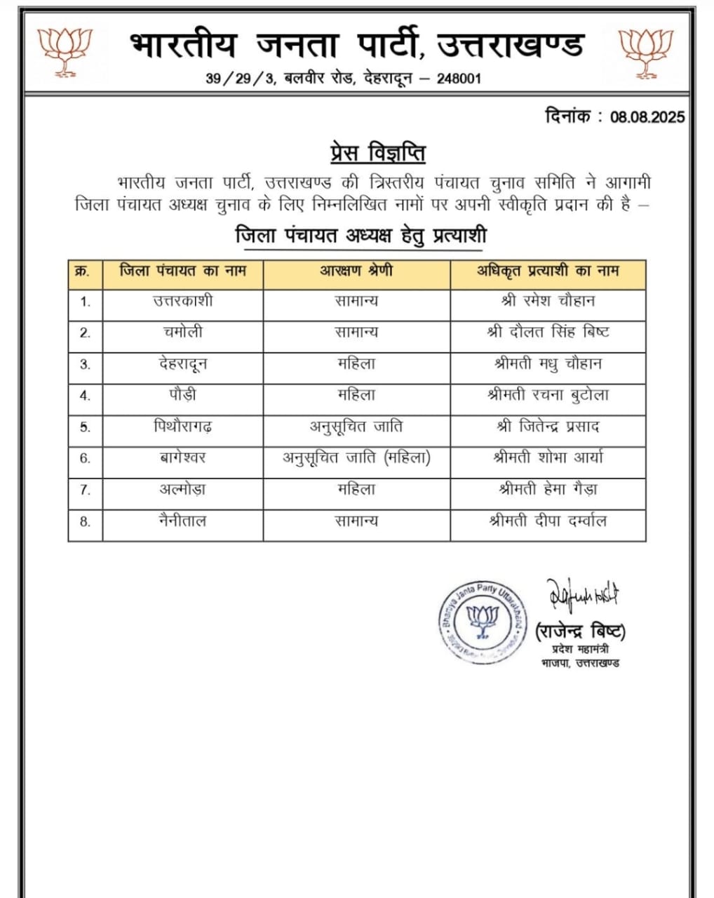 देहरादून—-  । भाजपा ने प्रदेश की पंचायतों मे 8 जिला पंचायत अध्यक्षों के लिए अधिकृत प्रत्याशियों की प्रथम सूची जारी कर दी है।