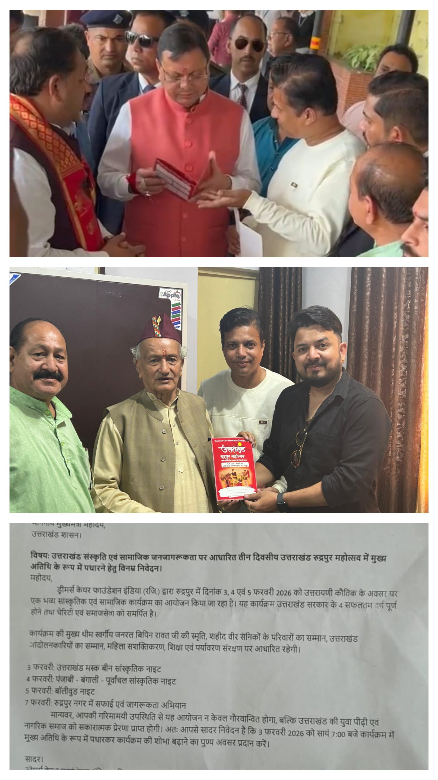 रुद्रपुर— ड्रीमर्स केयर फाउंडेशन इंडिया (रजि.) द्वारा आगामी 3, 4 एवं 5 फरवरी 2026 को संपन्न होने वाले उत्तराखंड रुद्रपुर महोत्सव हेतु फाउंडेशन की टीम द्वारा मुख्यमंत्री उत्तराखंड पुष्कर सिंह धामी एवं उत्तराखंड के पूर्व मुख्यमंत्री एवं पूर्व राज्यपाल महाराष्ट्र-गोवा भगत सिंह कोश्यारी को औपचारिक निमंत्रण पत्र भेंट किया गया।