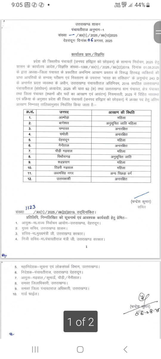 देहरादून— उत्तराखंड सरकार ने त्रिस्तरीय पंचायत चुनाव, 2025 (जनपद हरिद्वार को छोड़कर) के लिए जिला पंचायत अध्यक्ष पदों का अंतिम आरक्षण तय कर दिया है।