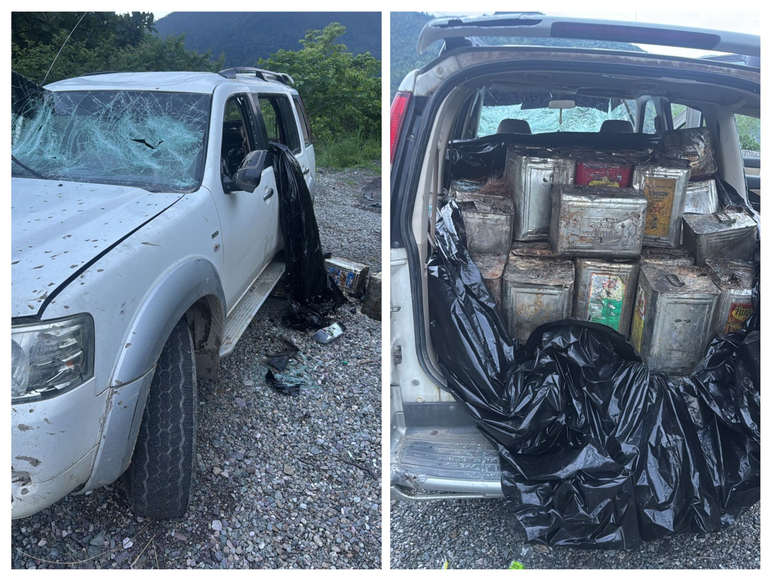 वन विभाग की टीम को देख तस्कर वाहन को क्षतिग्रस्त कर लीसे से लदे कंटरों को झाड़ियों में फेंककर हुए फरार, फरार तस्करों की धरपकड़ जारी हैं।