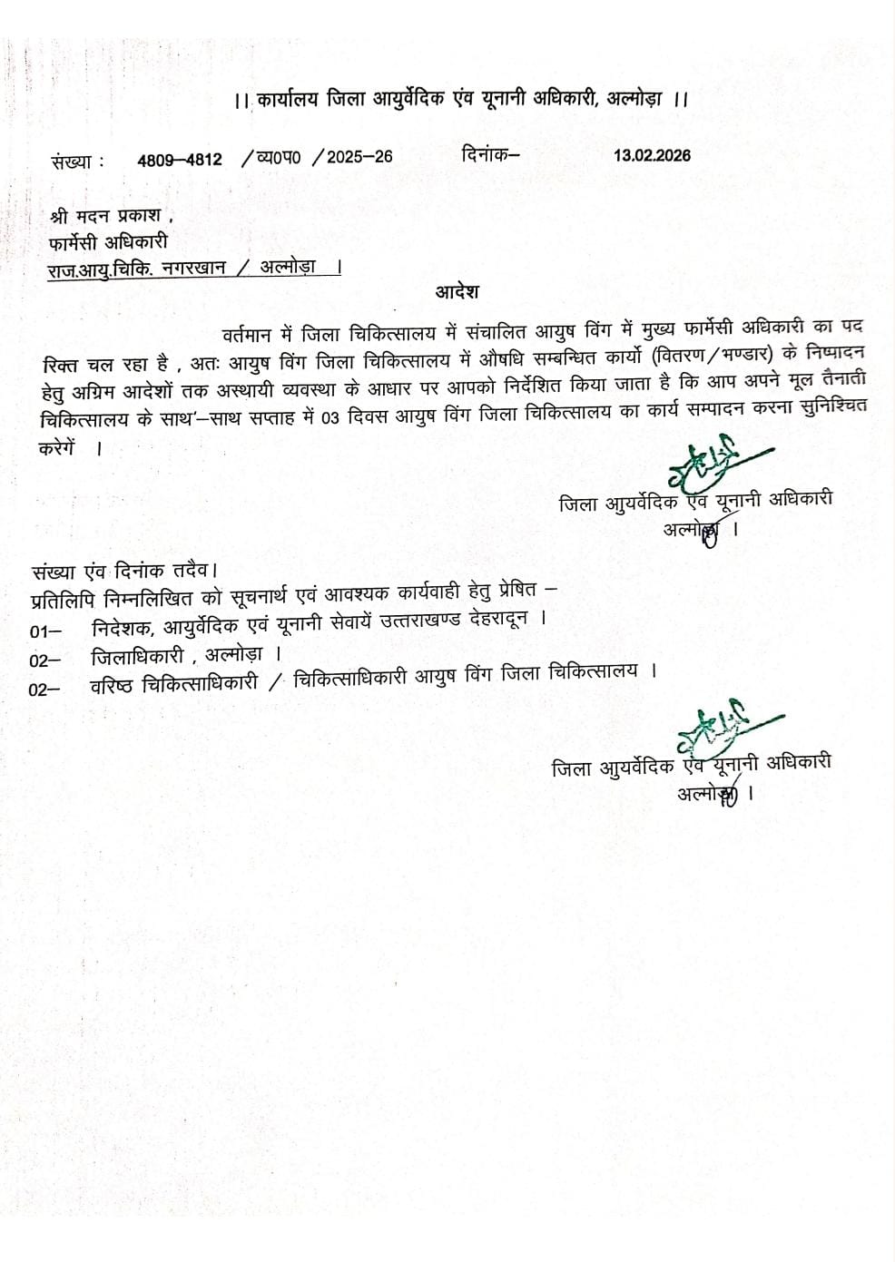 अल्मोड़ा— वर्षों से बिना फार्मेसी अधिकारी के संचालित हो रहे राजकीय आयुर्वेदिक चिकित्सालय अल्मोड़ा में अंततः अस्थायी फार्मेसी अधिकारी की नियुक्ति के आदेश जिला आयुर्वेदिक एवं यूनानी अधिकारी द्वारा जारी कर दिए गए हैं।