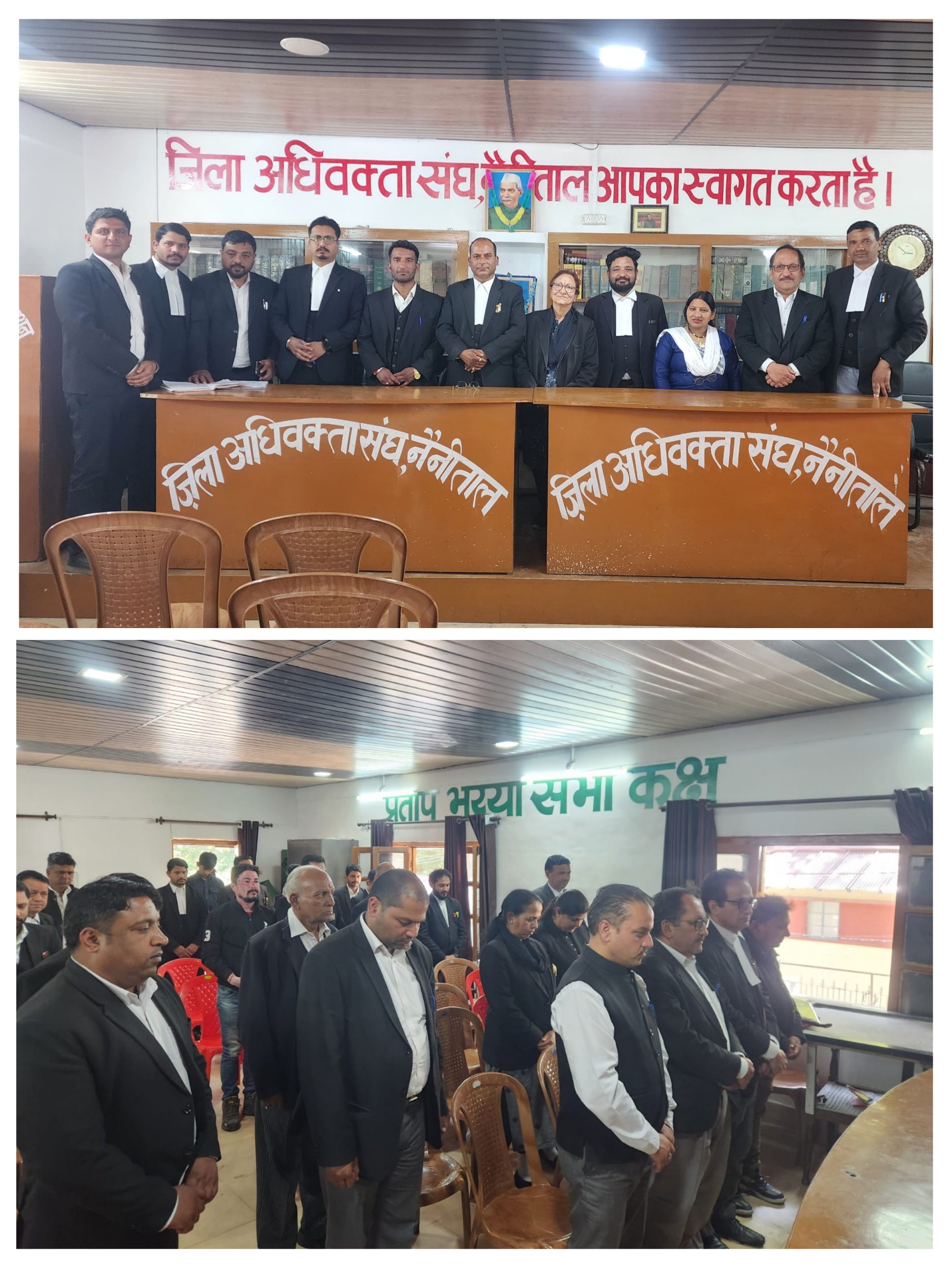 इस दौरान सचिव दीपक रूवाली मनीष मोहन जोशी नीरज साह ओंकार गोस्वामी राजेन्द्र कुमार पाठक हरिशंकर कंसल गिरीश खोलिया राजेश चंदोला ज्योति प्रकाश बोरा अरुण बिष्ट घनानंद बर्थवाल राजेंद्र सिंह मेहरा पंकज सिंह बिष्ट शंकर चौहान प्रीति साह संजय सुयाल राजेश त्रिपाठी बलवंत सिंह थलाल पंकज कुमार कैलाश ब्ल्यूटिया कैलाश जोशी शरत साह संजय त्रिपाठी अनिल बिष्ट नवीन पंत प्रकाश पांडेय अशोक मौलेखी प्रमोद तिवारी गिरीश जोशी नीलेश भट्ट हरीश भट्ट यशवंत सिंह बिष्ट अरुण बिष्ट राजेश टंडन अखिलेश साह राजेंद्र परगाई रितेश कुमार दयाकिशन पोखरिया गिरीश बहुखंडी अखिल साह अनिल हर्नवाल सुभाष जोशी कमल चिलवाल शिवांशु जोशी निखिल बिष्ट भगवत जंतवाल तरुण चंद्रा उमेश कांडपाल नीरज गोस्वामी दिग्विजय मेहरा आनंद कनवाल हितेश पाठक यशपाल आर्या नीरज कुमार निर्मल सहित अन्य अधिवक्ता मौजूद रहे।