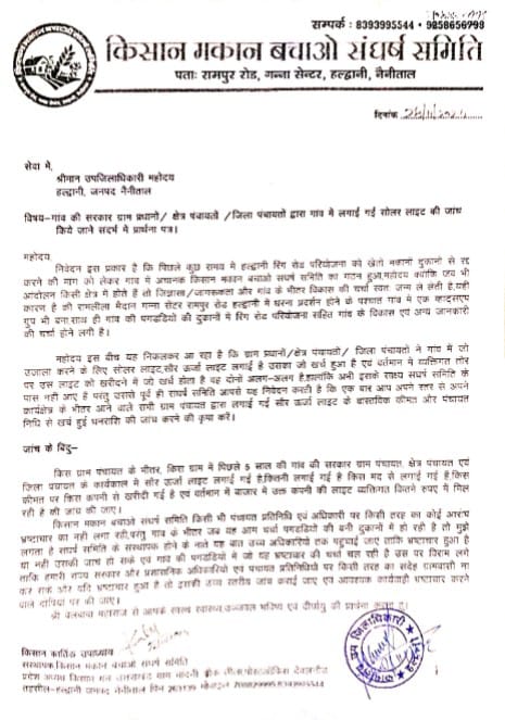 इन चर्चाओं पर विराम लगे इस उद्देश्य से किसान मकान बचाओ संघर्ष समिति ने हल्द्वानी उप जिला अधिकारी को एक पत्र सौंपा है,जिसमें समिति द्वारा हल्द्वानी उप जिलाधिकारी से पंचायतों द्वारा गांव में लगी सोलर लाइट के व्यय की जांच किए जाने की मांग करी है।