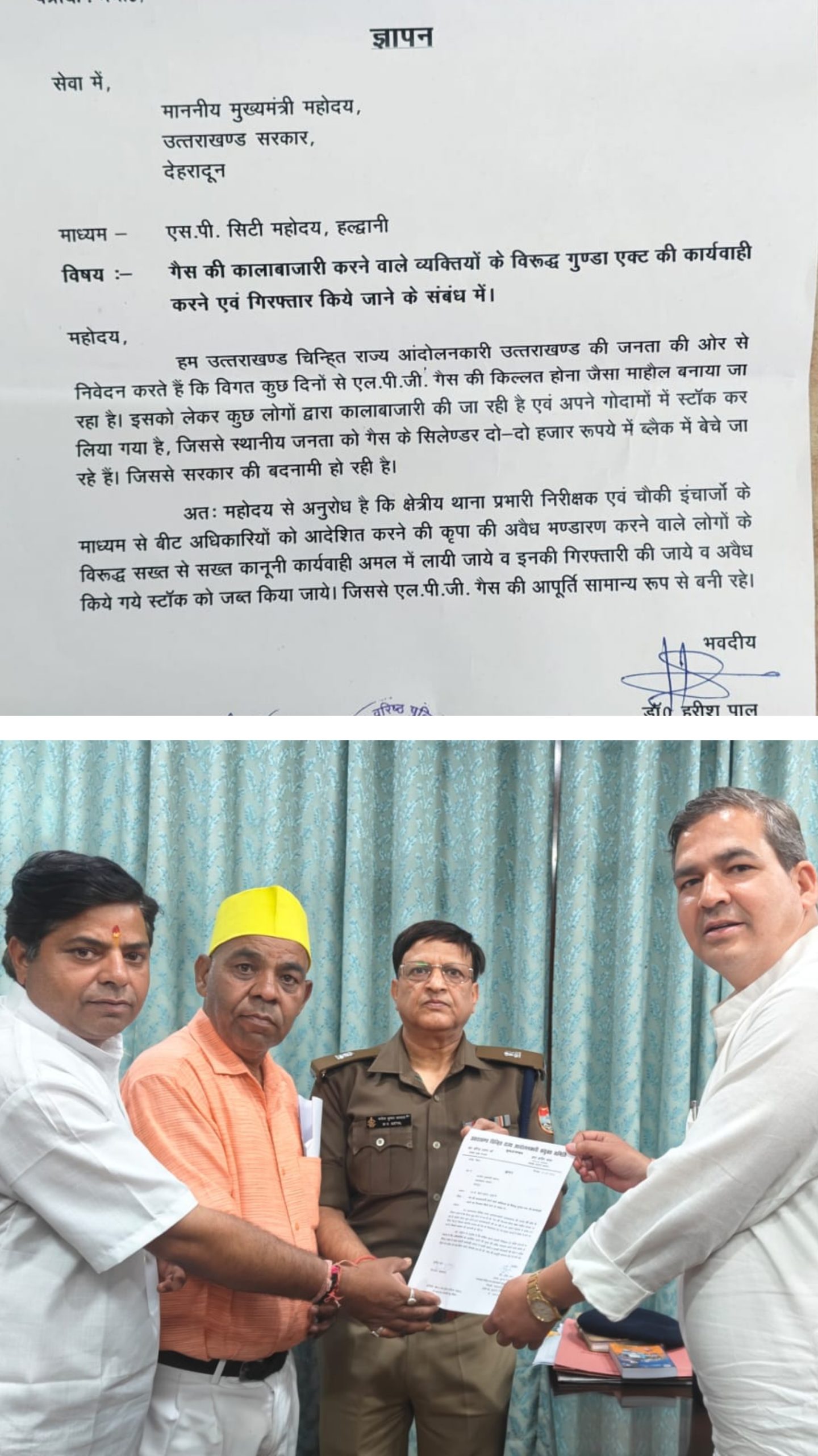 नैनीताल— हल्द्वानी क्षेत्र में एल.पी.जी. गैस की कालाबाजारी और कृत्रिम किल्लत को लेकर आज उत्तराखण्ड चिन्हित राज्य आंदोलनकारी संयुक्त समिति के कुमाऊँ मण्डल अध्यक्ष डॉ. हरीश पाल तथा स्वराज हिन्द फौज के संस्थापक अध्यक्ष सुशील भट्ट के संयुक्त नेतृत्व में एक प्रतिनिधिमंडल ने एस.पी. सिटी हल्द्वानी के माध्यम से माननीय मुख्यमंत्री को संबोधित एक ज्ञापन सौंपा।