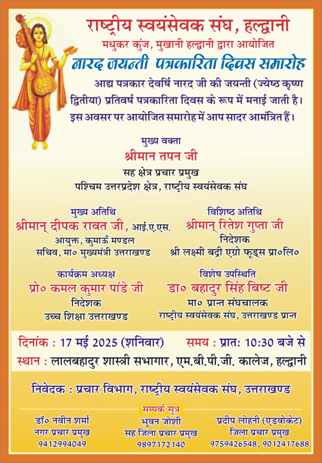 हल्द्वानी–प्रचार विभाग राष्ट्रीय स्वयंसेवक संघ हल्द्वानी द्वारा आगामी 17 मई 2025 , शनिवार को हल्द्वानी के एम. बी. पी. जी राजकीय महाविद्यालय हल्द्वानी के लाल बहादुर शास्त्री सभागार में भव्य नारद जयंती कार्यक्रम का आयोजित किया जाएगा ।