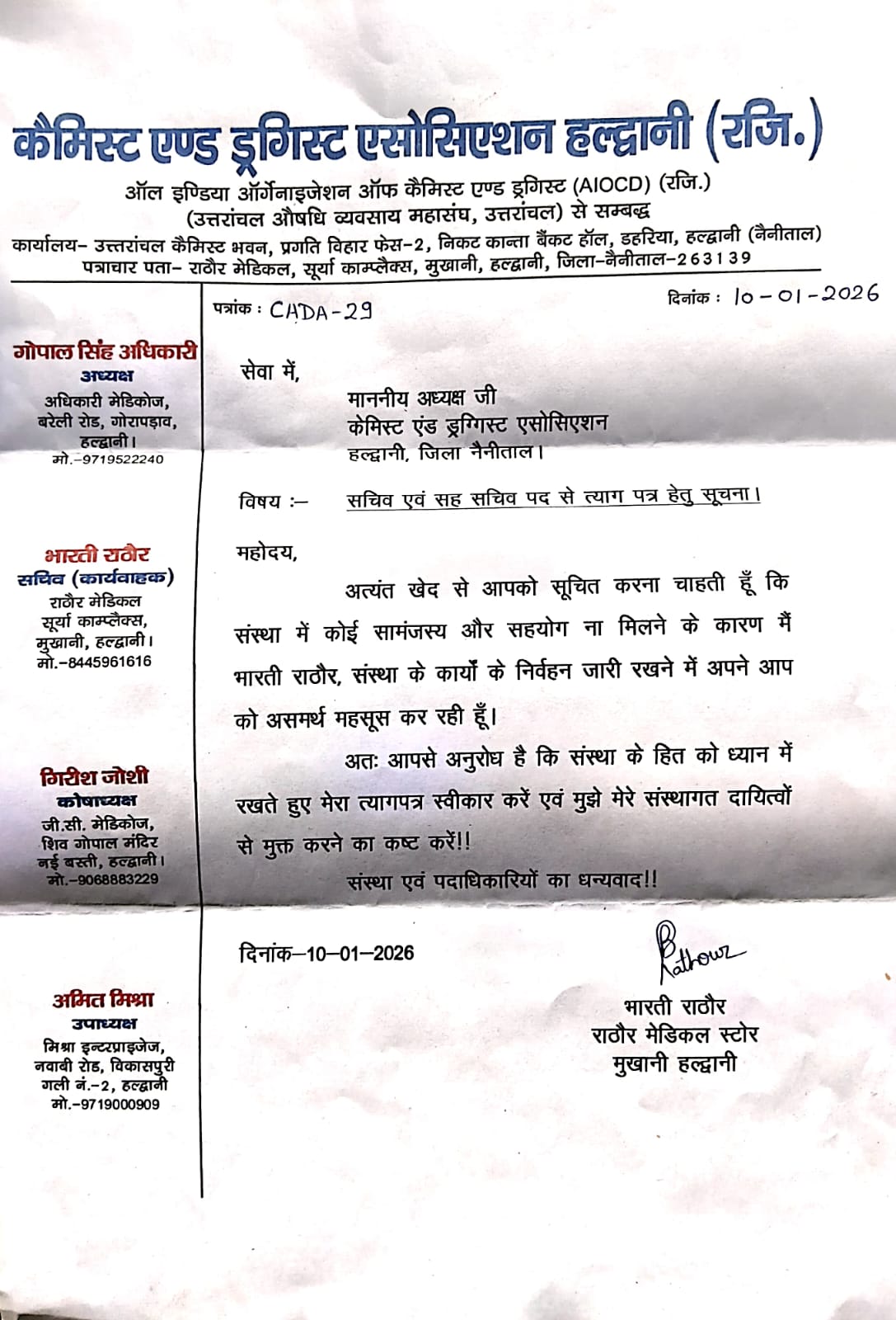 हल्द्वानी— कैमिस्ट एंड ड्रगिस्ट एसोसिएशन ,हल्द्वानी में उस समय हलचल मच गई जब संगठन की कार्यवाहक सचिव ने अचानक अपने पद से इस्तीफा दे दिया। इस्तीफे की खबर सामने आते ही दवा व्यवसाय से जुड़े सदस्यों में चर्चाओं का दौर शुरू हो गया है।