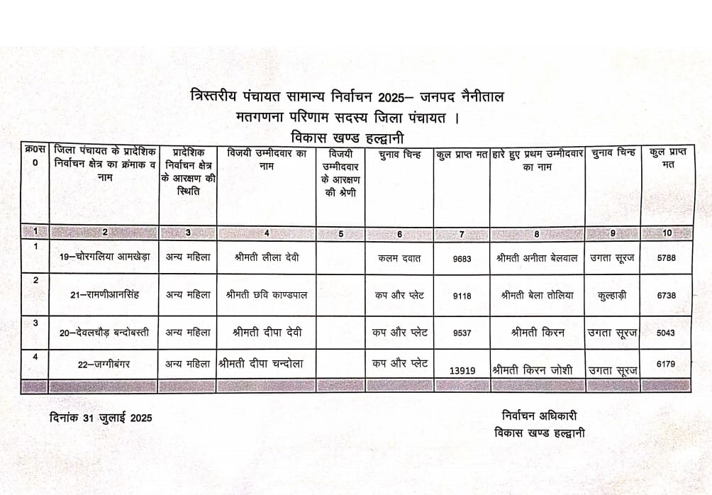 नैनीताल— त्रिस्तरीय पंचायत सामान्य निर्वाचन 2025 के तहत जिला पंचायत सदस्य पद हेतु हुए चुनावों के नतीजे घोषित कर दिए गए हैं। विकास खंड हल्द्वानी के विभिन्न प्रादेशिक निर्वाचन क्षेत्रों में निर्दलीयों ने शानदार प्रदर्शन करते हुए जीत का परचम लहराया है।