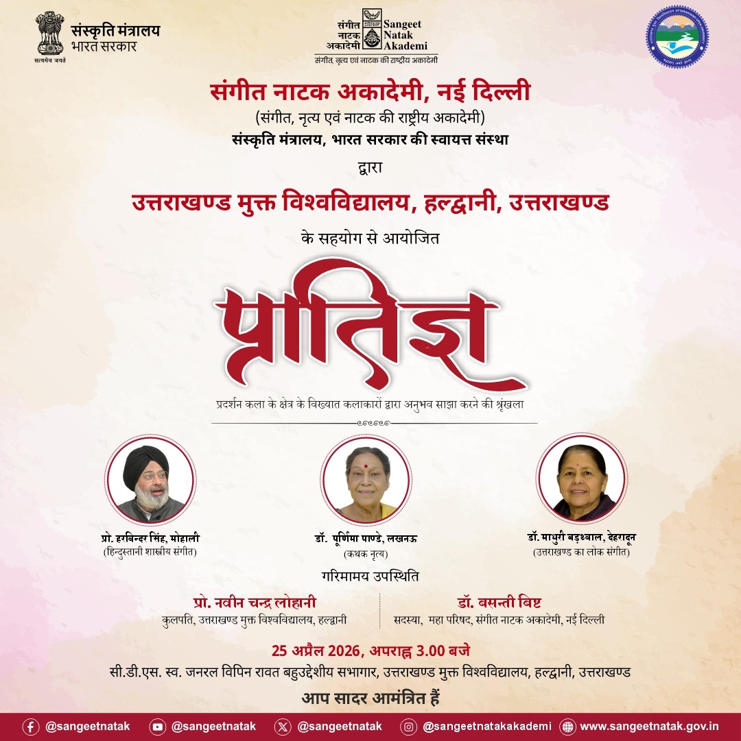 हल्द्वानी—   संगीत, राष्ट्रीय नृत्य एवं नाटक अकादमी, नई दिल्ली (संगीत नाटक अकादमी), संस्कृति मंत्रालय, भारत सरकार की स्वायत्त संस्था द्वारा उत्तराखण्ड मुक्त विश्वविद्यालय, हल्द्वानी के सहयोग से “प्रातिज्ञ” कार्यक्रम का आयोजन किया जा रहा है।