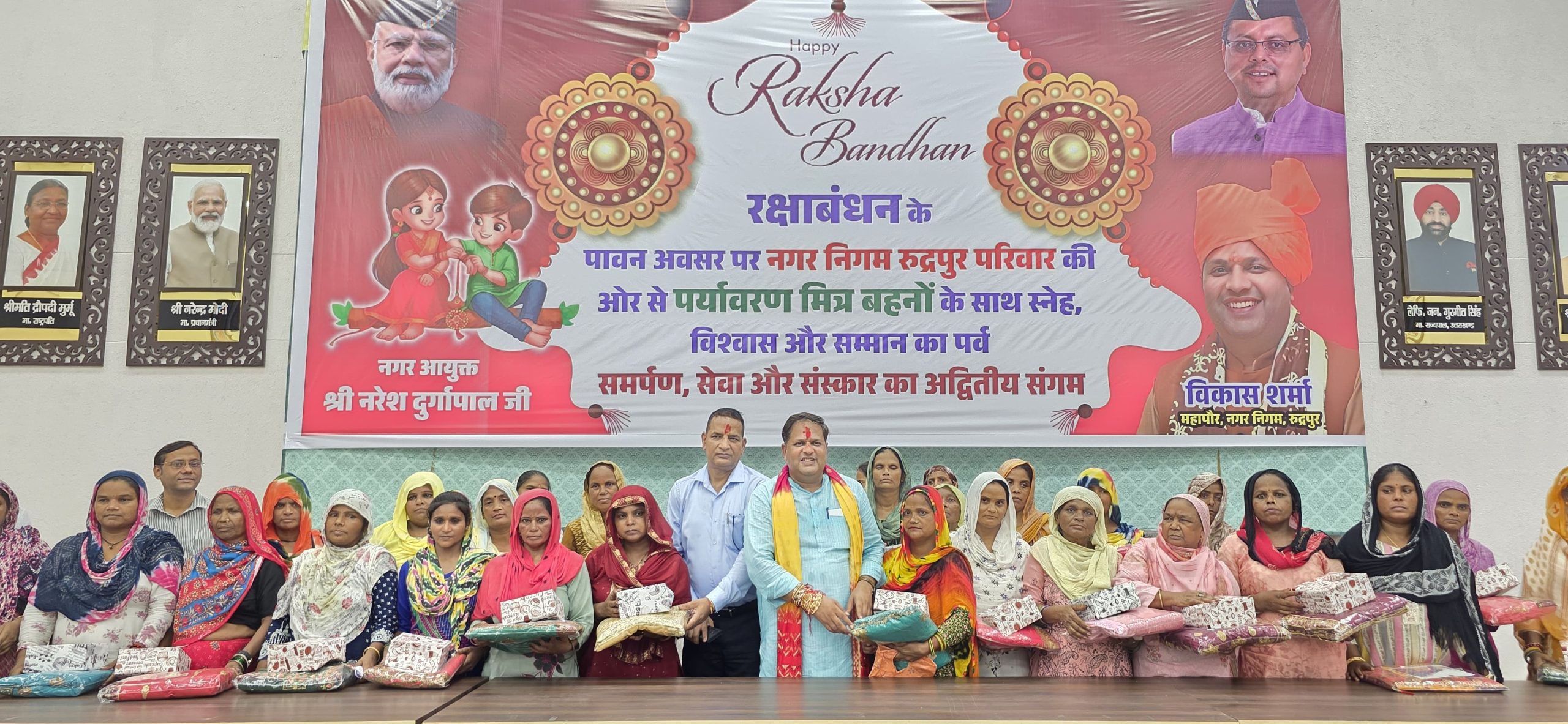 रुद्रपुर – नगर निगम सभागार में गुरुवार को रक्षाबंधन का पर्व परंपरागत रीति-रिवाजों और हर्षाेल्लास के साथ मनाया गया। इस विशेष अवसर पर नगर निगम की महिला कर्मचारियों, पर्यावरण मित्र बहनों एवं महिला स्वयं सहायता समूहों से जुड़ी सैकड़ों महिलाओं ने महापौर विकास शर्मा और नगर आयुक्त नरेश दुर्गापाल को रक्षा सूत्र बांधकर उनके दीर्घायु एवं सुखमय जीवन की कामना की।