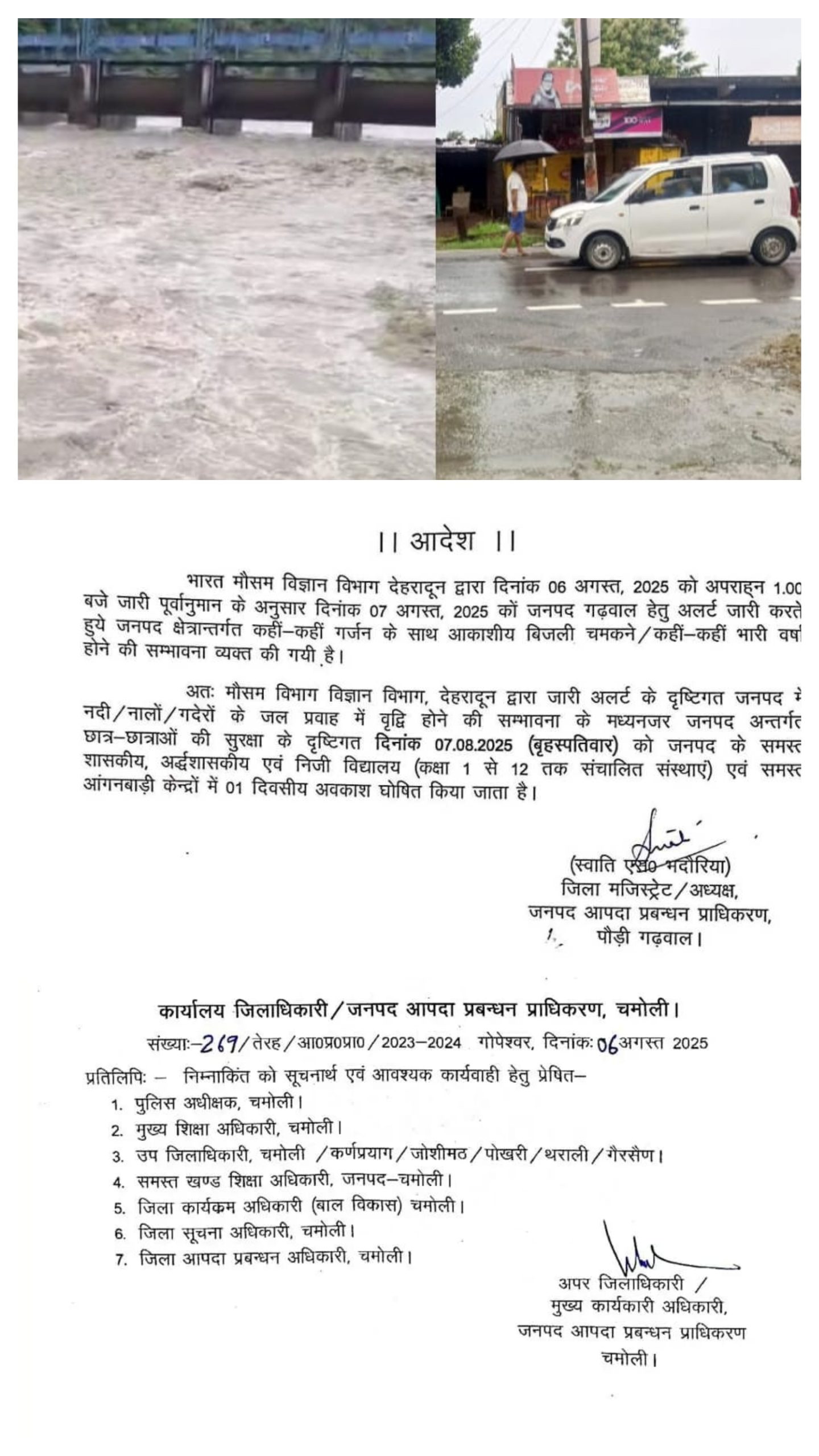 नैनीताल—  उत्तराखंड में मौसम विभाग ने अगले 18 घंटे के लिए भारी बारिश का रेड अलर्ट जारी किया है। इसके चलते जिला प्रशासन ने छात्रों और शिक्षण स्टाफ की सुरक्षा को ध्यान में रखते हुए उत्तरकाशी, पौड़ी और चमोली में 7 अगस्त 2025 को सभी स्कूल (कक्षा 1 से 12) और आंगनबाड़ी केंद्रों में अवकाश घोषित किया है। हालांकि, परीक्षाएं तय समयानुसार आयोजित होंगी।