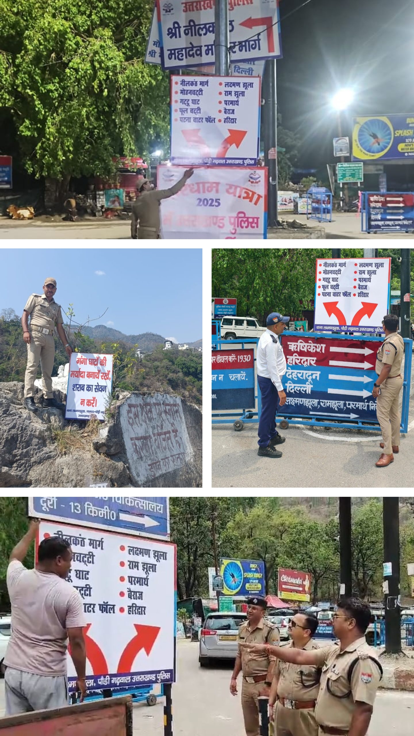 चार धाम यात्रा मार्ग पर जगह-जगह कई लिंक मार्ग भी जुड़े हैं जहां दिशा सूचक बोर्ड न होने से यात्री भटक जाते हैं ,इसलिए श्रद्धालुओं की सुगम यात्रा हेतु पुलिस द्वारा आवश्यक स्थानों पर लगातार चारधाम यात्रा रुट डायवर्जन से संबंधित साईन बोर्ड स्थापित किए जा रहे हैं, साथ ही लक्ष्मणझूला क्षेत्रान्तर्गत गंगा घाटों पर सुरक्षा व घाटों पर स्वच्छता बनाये रखने सम्बन्धी साइन बोर्डों को लगाकर भी पर्यटकों/श्रद्धालुओं को जागरूक किया जा रहा है।