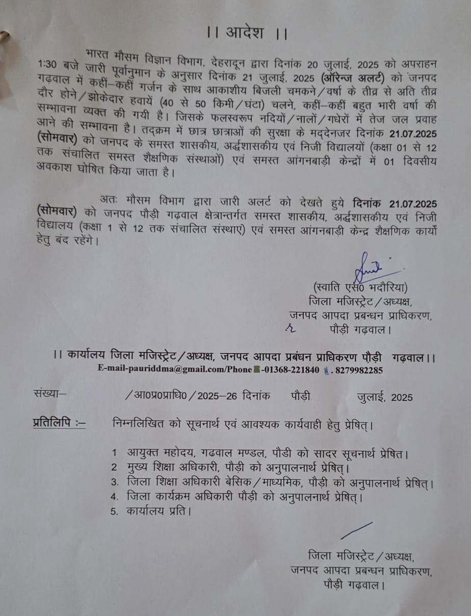 पौडी— जिलाधिकारी स्वाति एस. भदौरिया बारिश के अलर्ट को देखते हुये जनपद में संचालित सभी शासकीय, अर्द्धशासकीय व निजी विद्यालयों (कक्षा 1 से 12 तक) एवं समस्त आंगनबाड़ी केंद्रों में 21 जुलाई को एक दिवसीय अवकाश घोषित किया है।